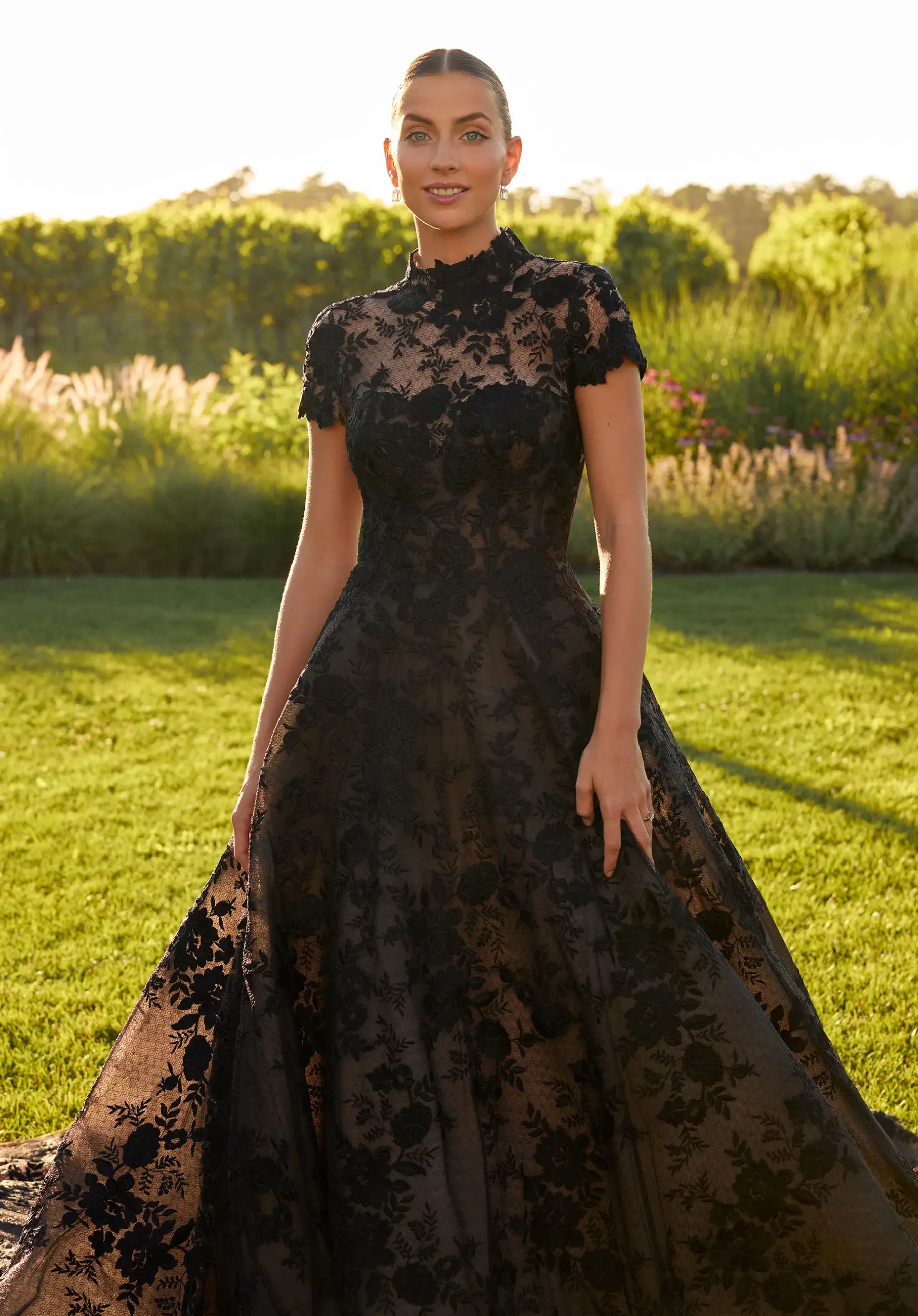 This gown is a showstopper. With a high mock neckline, open back, and full black floral lace over a nude underlay, it’s the perfect blend of elegance and drama.